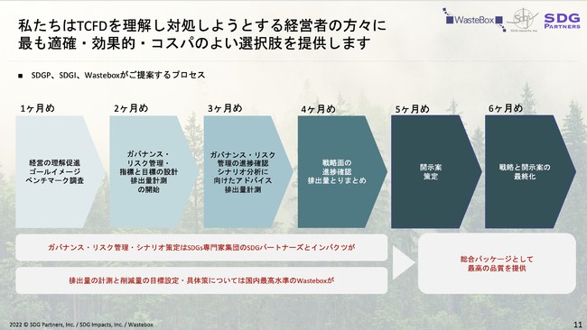 SDGパートナーズとSDGインパクツはともに、外務省・国連・コンサルティング会社での豊富な経験を基にサステナビリティに関するコンサルティング事業を展開する田瀬和夫氏がリードする会社です。また、ウェイストボックスは温暖化ガス排出量の測定では国内ではトップクラスの実績を持つ、鈴木修一郎氏が率いる会社です。この度、両社の協力により、これからTCFDに対応していこうという企業に対して、正確な理解と方法論を用い、経営層も巻き込んだ形で気候変動を経営の課題と位置づけ、盤石な組織統合とシナリオ作成、排出量測定と削減計画立案、そして開示までをサポートする「TCFD攻略パッケージ」を開発しご提供することとしました。パッケージは3か月、6か月、11か月の3つのパターンでご用意しています。