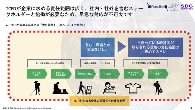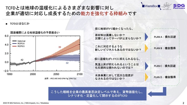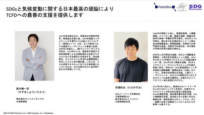 SDGパートナーズ有限会社(本社:東京都中央区、代表取締役 田瀬和夫)は、株式会社ウェイストボックス(本社:愛知県名古屋市中区、代表取締役 鈴木修一郎)ならびに株式会社SDGインパクツ(本社:東京都千代田区、代表取締役 田瀬和夫)との共同事業として、「TCFD攻略パッケージ」を発表しました。