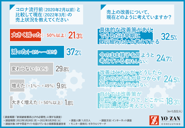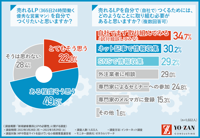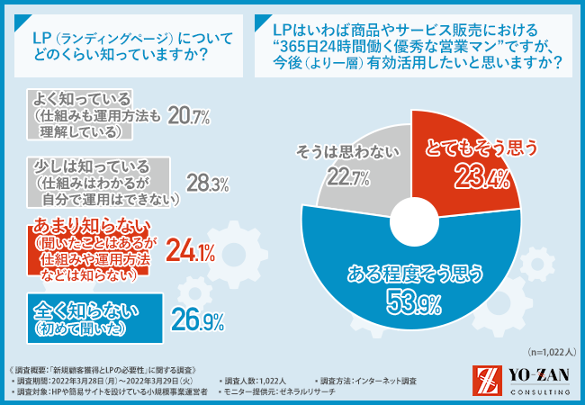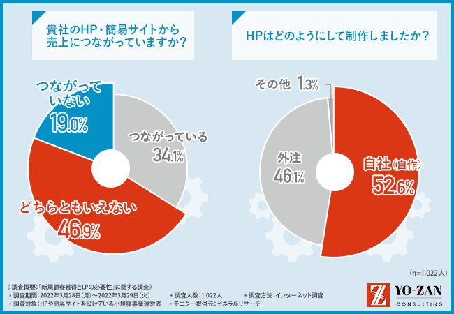 そこで今回、「売上をつくり続ける仕組みをつくる」をモットーに、「最短で売上をつくる」プロフェッショナルである、株式会社YO-ZAN(https://yo-zan1.com/)は、HPや簡易サイトを設けている小規模事業者を対象に、「新規顧客獲得とLPの必要性」に関する調査を実施しました。
