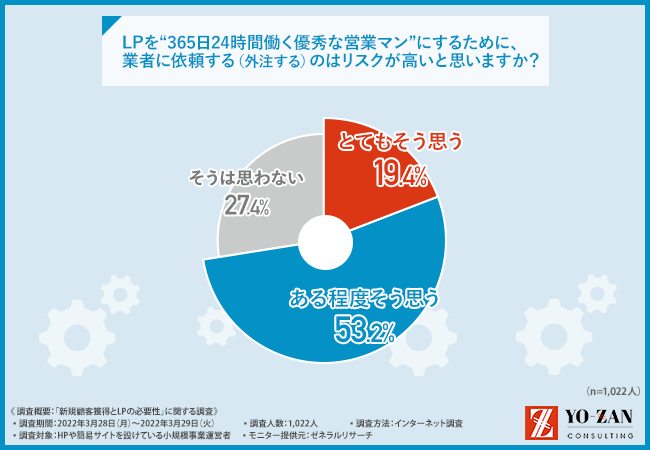そこで、「LPを“365日24時間働く優秀な営業マン”にするために、業者に依頼する(外注する)のはリスクが高いと思いますか?」と質問したところ、『とてもそう思う(19.4%)』『ある程度そう思う(53.2%)』『そうは思わない(27.4%)』という結果となりました。