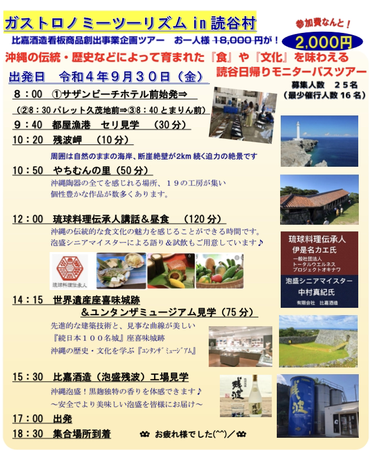 沖縄を代表する酒造メーカー(有)比嘉酒造と地域観光を企画する(有)沖縄スカイ観光サービスは、地域の魅力に触れながら沖縄の歴史と食文化を味わうモニター日帰りバスツアーを読谷村にて実施いたします。(実施日:2022年9月30日(金))