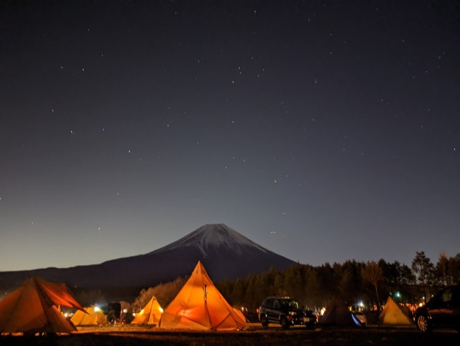 夜のキャンプ場を見渡すと、色とりどりのテントから漏れる優しい灯りが幻想的な雰囲気を醸し出しています。