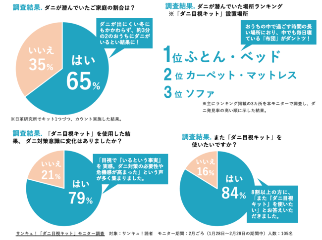 今年2月、「愛と情熱のダニ捕り研究所」オープンに先立ち、雑誌『サンキュ!』の読者105名が「ダニ目視キット」をモニター使用。おうちの気になる場所に設置していただき、アンケートを取りました。その結果、ダニが出にくい冬でも約3人に2人のおうちでダニを発見! 8割近くが「ダニ対策への意識に変化があった」と答えました。