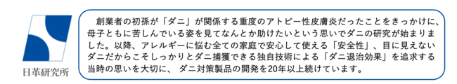 そこで日革研究所グループは、正しい知識や撃退方法を発信するべく、情報サイト「愛と情熱のダニ捕り研究所」をオープンしました。ダニ研究をわかりやすく解説するレポートや、主力商品「ダニ捕りロボ」、ユニークな「ダニ目視キット」など当社製品のご紹介、雑誌『サンキュ!』(ベネッセコーポレーション刊)やママ雑誌読者を対象におこなったダニ調査結果も公開します。