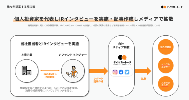 ティッカートークは、SNS時代の個人投資家向けメディアです。IRの領域で「機関投資家」と「個人投資家」の間にある情報の非対称性を解消すべく、上場企業に対して決算発表直後にIRインタビューを実施。インタビュー内容をビジュアル記事化してメディア掲載し、個人投資家の皆様へ鮮度の高い情報を届けています。