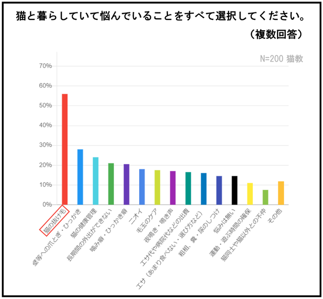 現在猫を飼っている200人にアンケートを実施した結果、猫の悩みの第1位は「猫の抜け毛」であることがわかりました。