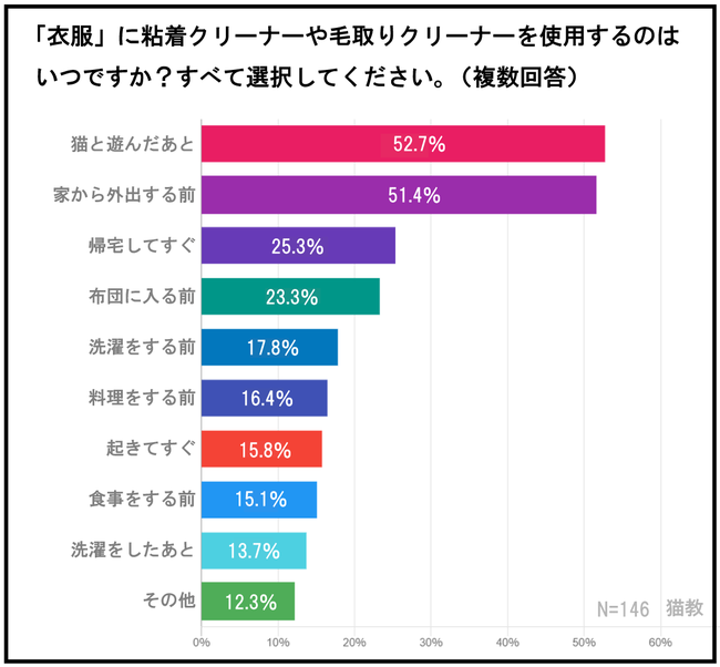 さまざまなタイミングで衣服に粘着クリーナー等を利用していることもわかりました。