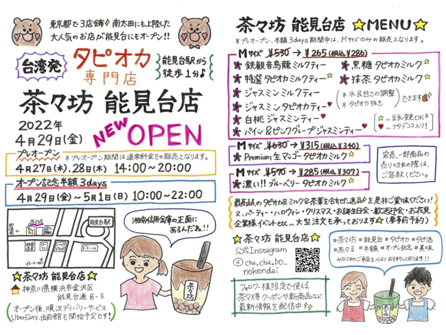 タピオカ専門店の『茶々坊』が、5店舗目となる新店舗を4月29日に神奈川県能見台にオープンすることをご報告致します。なお神奈川県内では2店舗目となります。