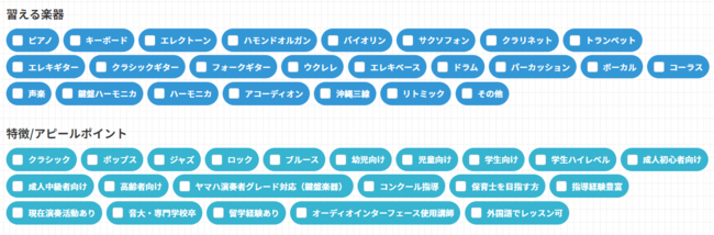 定番の楽器であるピアノやギターから、沖縄三線などの民族楽器や、「ハモンドオルガン」といった珍しい楽器まで、さまざまな楽器を習うことが可能です。2022年4月現在、習える楽器は以下の通りです。