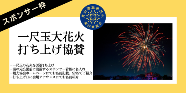 企業向けに一尺玉を打ち上げる協賛商品。会場アナウンスや湯の元公園入り口に設置する協賛看板に名入れするなどスポンサーとして紹介します。