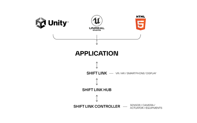 SHIFT LINKは特定の機器やプラットフォームに依存せず、多種多様な環境でも柔軟で安定的に動作するシステムを構築します。また国際的なWeb標準技術や、ゲームエンジンUnity、Unreal Engine 5など、環境に合わせたプラットフォームを適用できます。使用デバイスは、ディスプレイやタッチパネル、センサー類を始め、AR/MR/VRデバイスへの展開も柔軟に対応します。