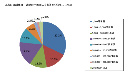 また、副業を実施している人は、「1週間の収入」の割合が1000円未満が32.2%である一方で、30,000円以上の収入を20%以上の人が得ていることが分かりました。