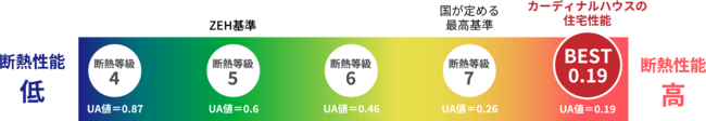 CARDINAL HOUSE BES-T 019は、外皮(壁・窓・天井・床)全体からの熱の逃げやすさを表した数値、UA値が0.19W/平方メートル ・K(※1)となっております。