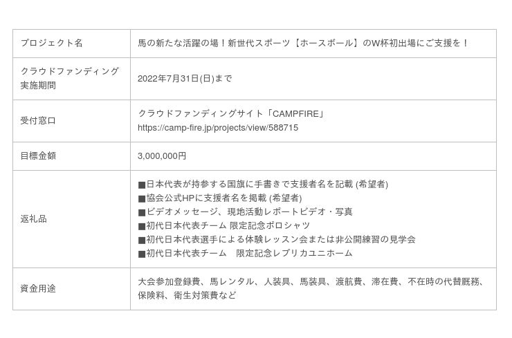 日本ホースボ―ル協会(代表:西島隆史、以下JHBA)は、2022年8月15日~8月20日の間、フランス サン=ローにて開催されるホースボールのワールドカップ(2022 FIHB WHR Horseball World Cup)に日本代表チームが初出場するのにあたり、その遠征・参加資金をクラウドファンディングサイトCAMPFIREにて募集を開始しました。募集期間は2022年7月31日(日)までで、金額は300万円を目指します。並行して、企業協賛も募集しております。