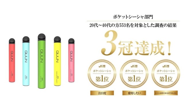 「チルをいつでも、どこでも」を体現する話題の使い捨てポケットシーシャの「QUUN」を製造、販売する合同会社VOICE(本社:東京都江東区) は、この度、20-40代の男女を対象に、ポケットシーシャを扱う8ブランド名のイメージ調査を実施。その結果3つの部門で「QUUN」が第一位を獲得しました。今回の受賞を記念して、期間限定で送料無料のキャンペーンを開催しております。