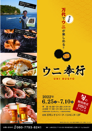 LH株式会社(代表取締役:林昭信)は、2022年6月25日(土)より 新潟市にて「~万代でウニが楽しめる~ ウニ奉行」を開催させていただくこととなりましたので ご報告いたします。 「ウニ」の「旬」はいつ頃かご存知でしょうか? そう。今なんです! このイベントは今が「旬」真っ盛りの東北産「ウニ」を新潟のお客様にお手頃価格でご提供する ことで「ウニは高い!」という概念を覆し、さらなる魅力を伝えたく開催いたします。 この度の開催の折には、たくさんの方々にご来店いただき“石巻産のウニ”をご堪能いただけれ ば幸いです。炭火で食べる旬のウニと海産物のBBQをお楽しみください。
