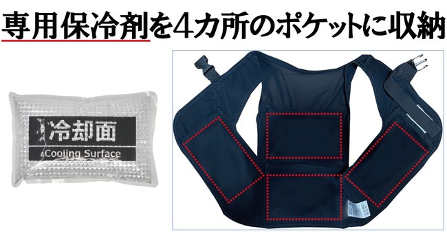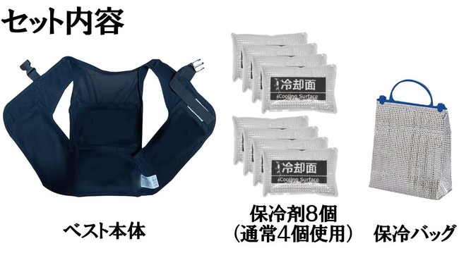 ベストに使用する保冷剤4個に加え、長時間使用を想定してさらに4個のスペア保冷剤を同梱しました。