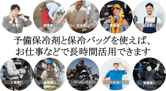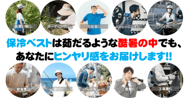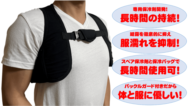 従来の保冷剤使用ベストの不満点である「短時間しかもたない」、「結露が不快」、「冷たすぎる」、「スペアのストック場所がない」を全て解決した独自企画の保冷ベストです。