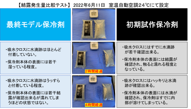 そこで私たちは保冷剤が肝であることに着目し、ベスト製造メーカーに頼っていた保冷剤の調達を見直し、保冷ベスト専用の保冷剤を開発することから始め、数々のテストを重ねた結果、冷た過ぎず、結露の発生を極力抑え、保冷持続時間の長い保冷剤が完成しました。