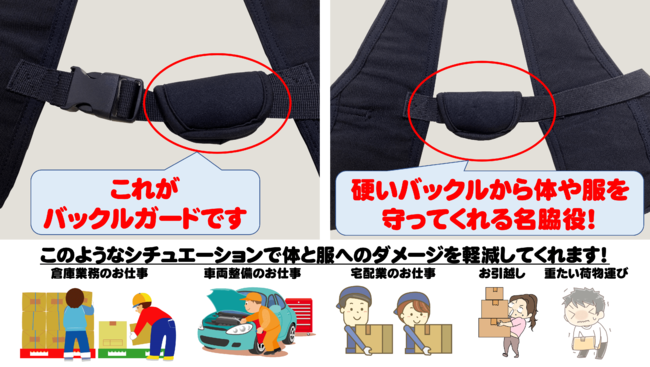 バックルガードを装備することで、バックル部への圧着によるダメージを軽減しました。