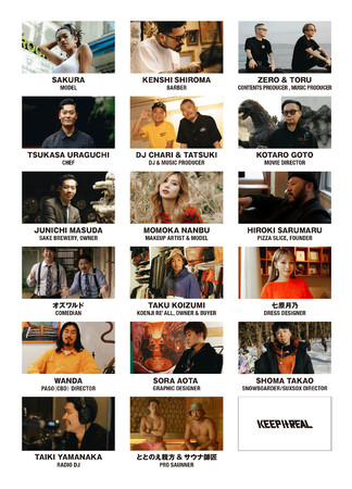 KEEP IT REALのプロデューサーである rikumaru が東京を拠点にDJとして活動する中で知り合った親交のあるメンバーです。記念すべき第一弾の出演者には、Netflixオリジナルシリーズ「全裸監督 シーズン2」監督である後藤 孝太郎氏や吉本興業の芸人であるオズワルド、また、日本のバーバー文化を牽引する「MR.BROTHERS CUT CLUB」の城間健士氏等、幅広い業界で活躍する"今をトキメク総勢14組"の出演者の方々が参加しています。