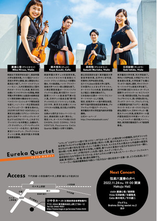 Eureka Quartetのメンバーを中心に、弦楽器・管楽器・ピアノ等さまざまな形式・編成でコンサートを開催予定です。