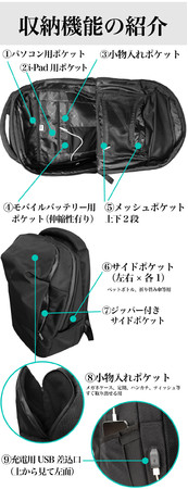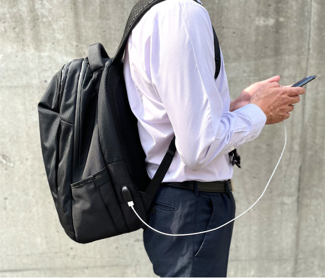 リュックに後付けするものもありますが、接続したUSBのコードが外に出ていると、引っかからない様に常に気を付けて歩くのは大変です。モバイルバッテリーを収納出来ないのも、ビジネスシーンでは困りますよね。