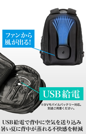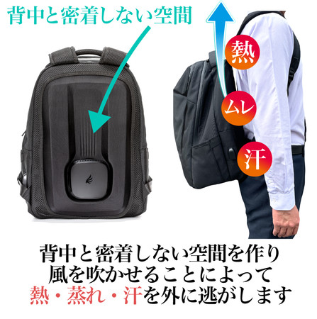 モバイルバッテリーを電源にして、リュックに組み込まれたファンを回し背中との間に風を送り込み、湿度と温度をコントロールすることに成功したリュックです。
