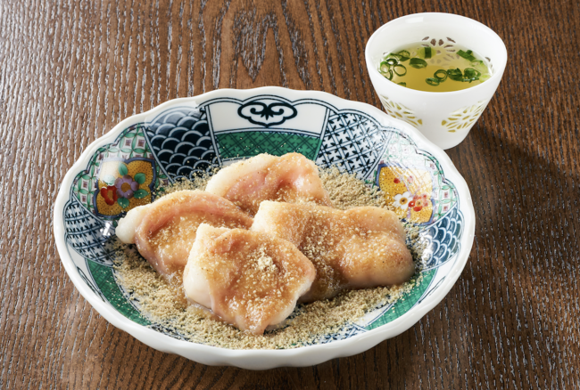 「秘伝の粉」を下味に焼き上げ、脂の旨味を引き出します。