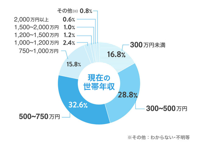 現在の年収(世帯年収)について500名の方に伺ったところ、一番多かったのが500~750万円の32.6%でした。