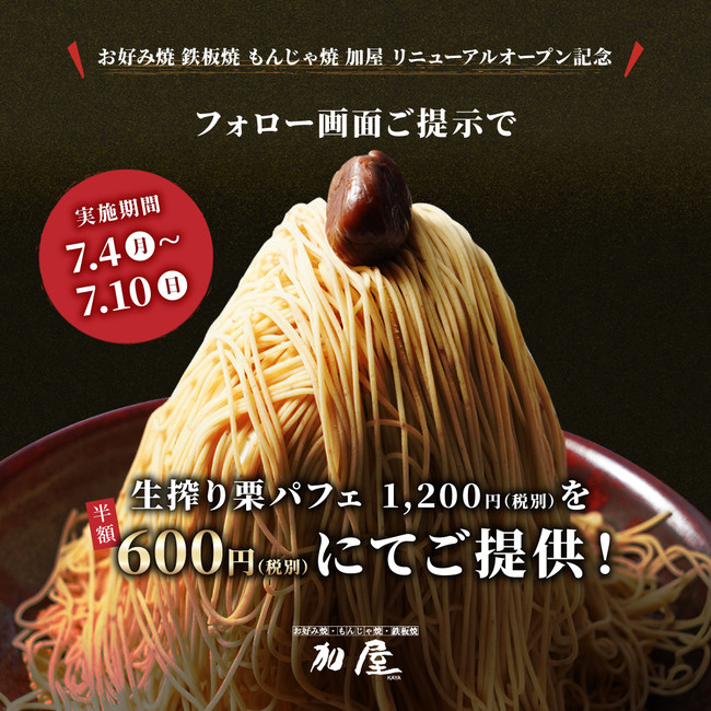 7/4(月)~7/10(日) フォロワー限定で生搾り栗パフェ1200円を半額600円でご提供!