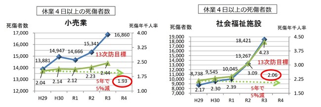 労働災害の発生件数は減少傾向にあったが、最近は横ばいの状況となっており、内訳を見ると小売業や社会福祉施設で増加している。多いのは「転倒」や「動作の反動」(腰痛)であり、これらだけで労働災害全体の約4割を占めるに至っている。