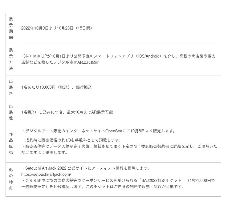 アートとデジタル新技術を活用した地域活性化を推進する株式会社MIX UP(ミックスアップ、本社:香川県高松市、代表取締役:香川智彦、濱川武明、三木健吾)は、高松市をはじめとする産官学の様々な団体の協賛・後援のもと”Setouchi Art Jack 2022(以下、SAJ2022)"を2022年10月9日より10月23日まで高松南3町商店街(南新町商店街、常磐町商店街、田町商店街)にて開催します。SAJ2022開催に際し、来場者が開催エリアを動き回る中、自身のスマートフォンARアプリを用いて鑑賞するデジタルアート作品(イラスト、写真、絵画、映像など)を広く公募します。応募資格に所属や活動歴などは問わず、希望者は2022年8月31日までにエントリーフォームにて申し込みを行い、その後9月10日までに作品データを提出頂きます。出展者はSAJ2022公式サイトで紹介され、また出展作品はデジタルアート販売のインターネットサイトOpenSeaにおいて販売され、成約時に購入代金(所定の委託販売手数料を控除)を受け取ることができます。