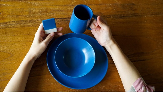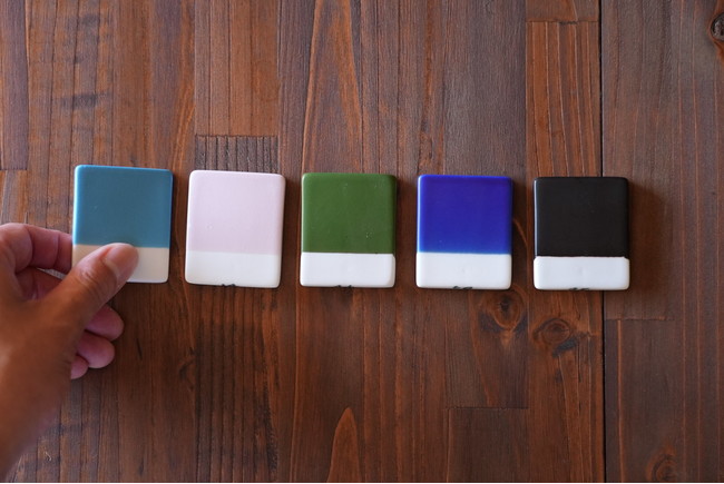 はじめに5色を選ぶと、その色見本タイルが届きます。これによって、スマホやPCの画面上ではわからない微妙な色の違いや質感を、直接手にとって確かめていただくことができます。最終的にお気に入りの1色を決めていただくとお手元に選んだ色の食器が届きます。