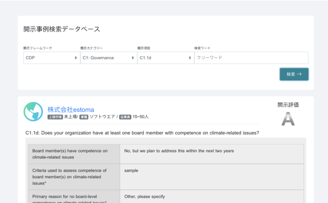 開示を行なっていく上で、他社の事例を調査することは、外部評価機関対応において必要不可欠な作業です。estomaでは、それぞれの開示フレームワークの開示項目ごとに実際の開示事例を数多く取り揃えています。