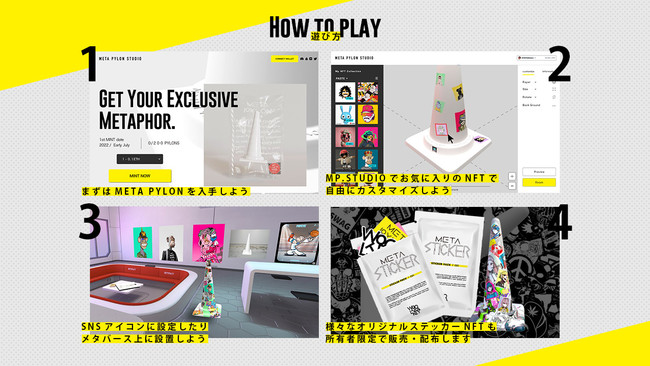 同プロジェクトは、META PYLONのホルダーが作成したオリジナルの作品達を現実の会場で展示するゲリライベントの企画や、実際のステッカーパックの販売、ユーザーが作成した三角コーンを実際に実物を入手し部屋に飾るといったリアルとメタヴァースの境を超えた次世代のクリエイティブとの関係を見出す展望を掲げています。