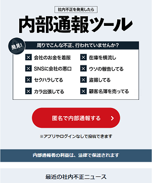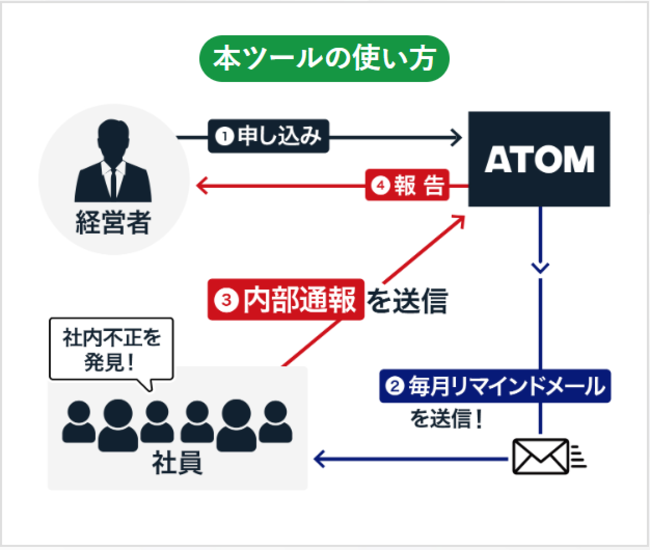 社内の不正行為を発見した社員が、アトム法律事務所を通じて会社に通報するためのツールです。