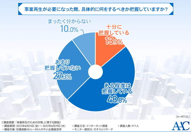 「事業再生が必要になった際、具体的に何をするべきか把握していますか?」と質問したところ、4割近くの方が『あまり把握していない(27.3%)』『まったく分からない(10.0%)』と回答しました。