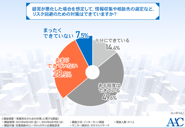 「経営が悪化した場合を想定して、情報収集や相談先の選定など、リスク回避のための対策はできていますか?」と質問したところ、4割近くの方が『あまりできていない(28.5%)』『まったくできていない(7.5%)』と回答しました。