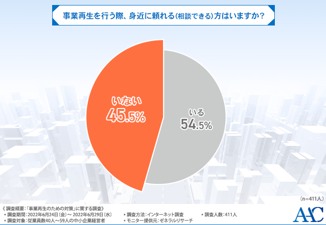 そこで、「事業再生を行う際、身近に頼れる(相談できる)方はいますか?」と質問したところ、4割以上の方が『いない(45.5%)』と回答しました。
