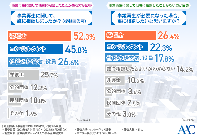 こちらの質問でも、「税理士」や「コンサルタント」と回答した方が多く、事業再生のアドバイザーとしての認識は共通しているようです。