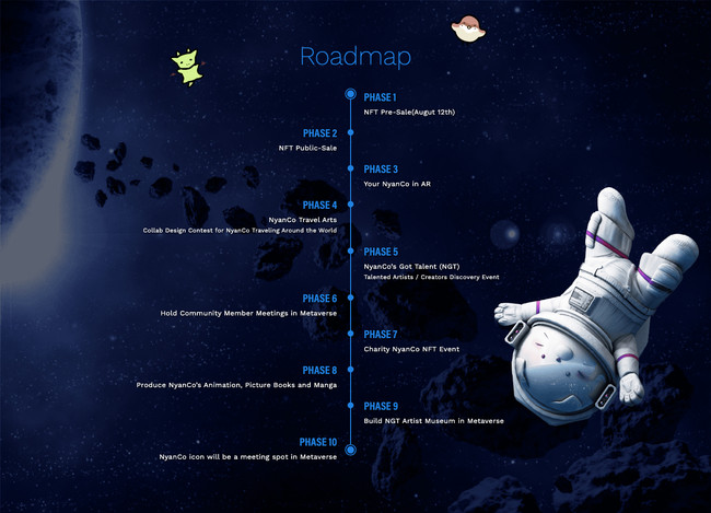 また、NyanCo.NFTが広まることによって、NyanCo.NFTがWeb3.0・メタバース世界における愛猫家としてのアイコンになることも目標としています。