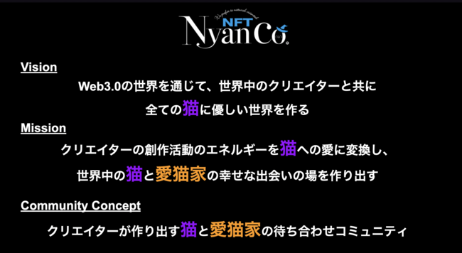 今回のNyanCo.NFTでは、現実世界の飼い主を待つ保護猫に変わって「Web.3.0の世界で飼い主を待つニャン公」をテーマにNyanCo.NFTを制作しました。猫を愛するホルダーにNyanCo.NFTを迎え入れてもらうことで、真に猫を愛する人たちの集まるコミュニティを構築し「ホルダーと共に猫にとって優しい世界を実現する」ことを目指すプロジェクトです。