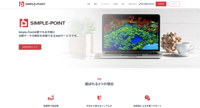 APEX株式会社(本社:東京都渋谷区、代表取締役社長:下戸 優輔、以下APEX)は写真や点群データ解析を依頼することができるクラウド型プラットフォーム「Simple-Point(シンプルポイント)」の提供を11月14日から開始いたします。本プラットフォームを利用することによりドローンで撮影した写真や点群データ、ハンディースキャナーなどにより取得した点群データの解析を自動化することが可能となります。取得したデータをアップロードすることにより業界最安クラスの価格帯で高品質な成果物をご提供します。