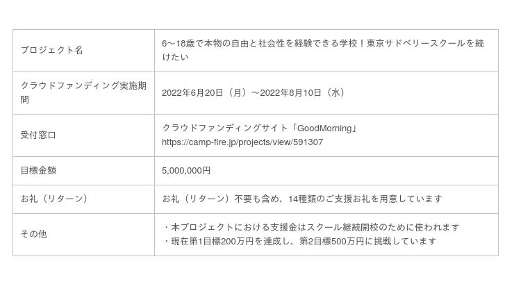 本校が、日本で最も子どもが多い首都東京の子どもたちのために、また子どもが自分で自分を育てる実践の場であり、子どもと一緒につくる理想社会の実験場であり続けるために、ぜひ教育の選択肢の1つとして、本校の存続をご支援いただければ幸いです。