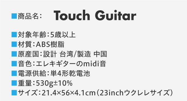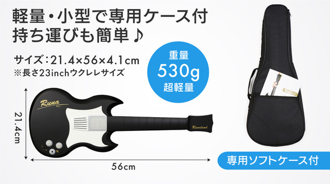 一般的なギターに比べて小型(21.4×56×4.1cm)で、軽量(530g)で、お子様(5歳以上)でも簡単に扱えます。