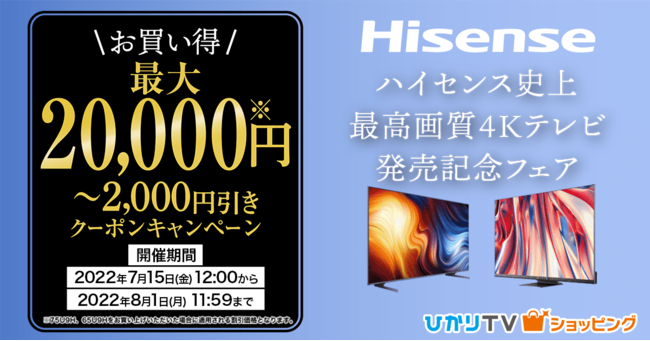 株式会社NTTドコモが運営するショッピングサービス「ひかりTVショッピング」は、お客さまに日ごろの感謝の気持ちを込めて、Hisenseの4K液晶テレビを対象とする「Hisense新製品発売記念 最大20,000円引きキャンペーン」を2022年7月15日(金)より開催します。