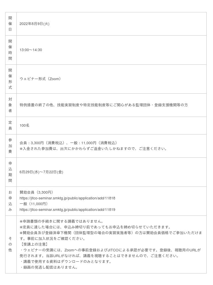 8月9日(火) ウェビナー開催 ※監理団体、登録支援機関等の技能実習・特定技能関係者向け