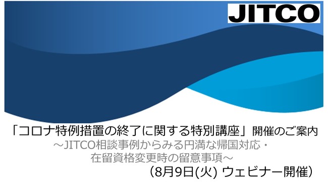 公益財団法人国際人材協力機構(JITCO)は、出入国在留管理庁が「帰国困難者に対する特例措置の終了」を発表したこと受け、主に技能実習生や特定技能外国人受入れの観点から、在留資格「特定活動」の概要、帰国に伴う確認事項、JITCOに寄せられる相談事例をもとにした在留資格変更時の留意点等について説明します。監理団体、実習実施者、登録支援機関等多くの皆様のご参加をお待ちしております。