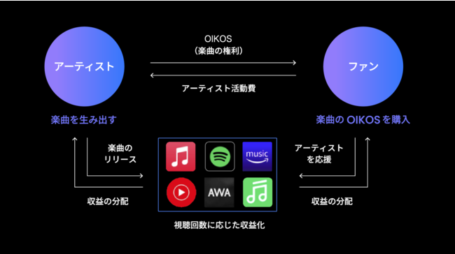 このたび、テクノロジーを駆使しアーティストとファンの新たな経済圏構築を目指したOIKOS MUSIC株式会社(本社:東京都千代田区 以下 OIKOS MUSIC / 当社 )を設立、8月30日(火)より、楽曲の権利(音楽サブスクリプションサービスにおける収益分配に限定)をアーティストとファンが共同保有できるマーケットプレイス「OIKOS MUSIC」の提供を開始いたします。